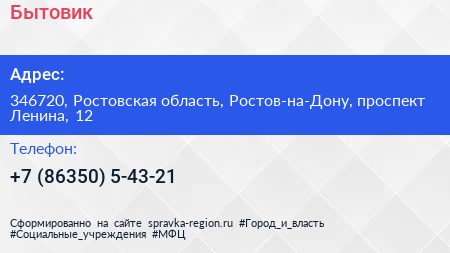 Бытовик по адресу 346720, Ростовская область, Ростов-на-Дону, проспект Ленина, 12 в дальнейшем Организация, размещена в следующих категориях: