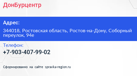 ДонБурцентр по адресу 344018, Ростовская область, Ростов-на-Дону, Соборный переулок, 94е в дальнейшем Организация, размещена в следующих категориях: