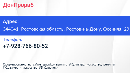 ДонПрораб по адресу 344041, Ростовская область, Ростов-на-Дону, Осенняя, 29 в дальнейшем Организация, размещена в следующих категориях: