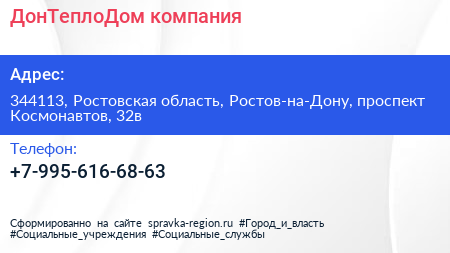 ДонТеплоДом, компания по адресу 344113, Ростовская область, Ростов-на-Дону, проспект Космонавтов, 32в в дальнейшем Организация, размещена в следующих категориях: