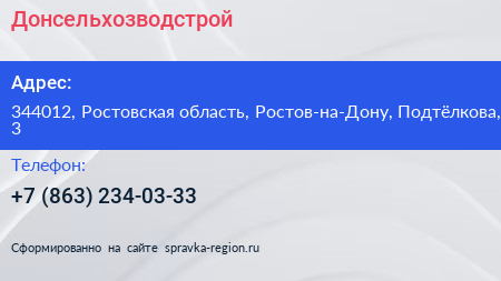 Донсельхозводстрой по адресу 344012, Ростовская область, Ростов-на-Дону, Подтёлкова, 3 в дальнейшем Организация, размещена в следующих категориях: