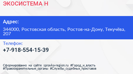 ЭКОСИСТЕМА-Н по адресу 344000, Ростовская область, Ростов-на-Дону, Текучёва, 207 в дальнейшем Организация, размещена в следующих категориях: