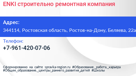 ENKI, cтроительно-ремонтная компания по адресу 344114, Ростовская область, Ростов-на-Дону, Беляева, 22а в дальнейшем Организация, размещена в следующих категориях: