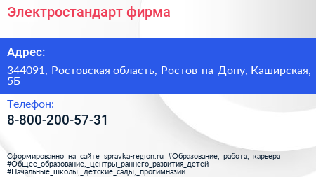 Электростандарт, фирма по адресу 344091, Ростовская область, Ростов-на-Дону, Каширская, 5Б в дальнейшем Организация, размещена в следующих категориях: