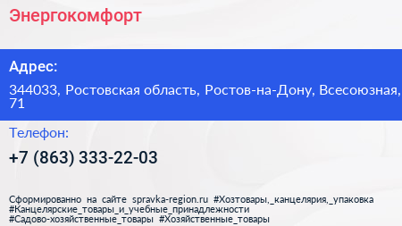 Энергокомфорт по адресу 344033, Ростовская область, Ростов-на-Дону, Всесоюзная, 71 в дальнейшем Организация, размещена в следующих категориях: