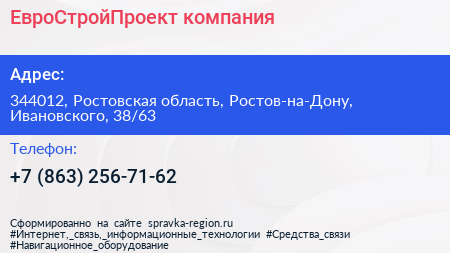ЕвроСтройПроект, компания по адресу 344012, Ростовская область, Ростов-на-Дону, Ивановского, 38/63 в дальнейшем Организация, размещена в следующих категориях: