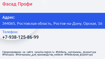 Фасад-Профи по адресу 344065, Ростовская область, Ростов-на-Дону, Орская, 16 в дальнейшем Организация, размещена в следующих категориях: