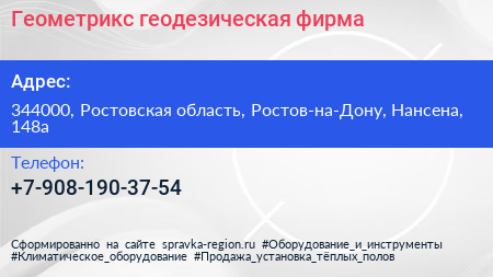 Геометрикс, геодезическая фирма по адресу 344000, Ростовская область, Ростов-на-Дону, Нансена, 148а в дальнейшем Организация, размещена в следующих категориях: