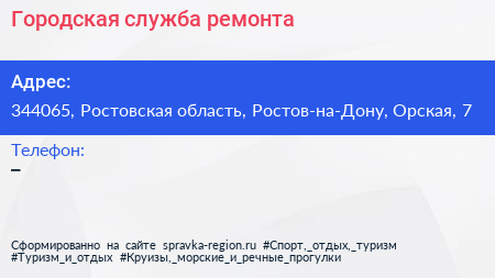 Городская служба ремонта по адресу 344065, Ростовская область, Ростов-на-Дону, Орская, 7 в дальнейшем Организация, размещена в следующих категориях: