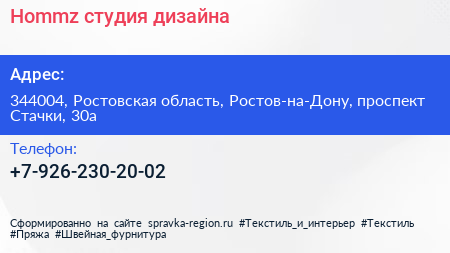 Hommz, студия дизайна по адресу 344004, Ростовская область, Ростов-на-Дону, проспект Стачки, 30а в дальнейшем Организация, размещена в следующих категориях: