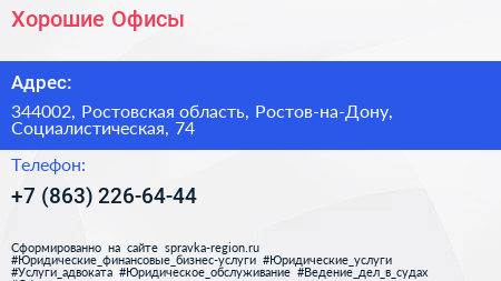 Хорошие Офисы по адресу 344002, Ростовская область, Ростов-на-Дону, Социалистическая, 74 в дальнейшем Организация, размещена в следующих категориях: