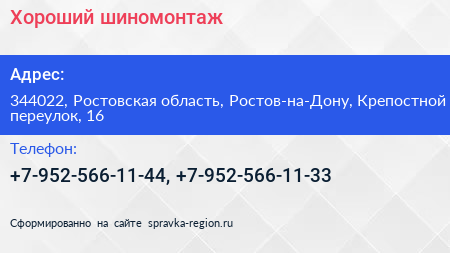 Хороший шиномонтаж по адресу 344022, Ростовская область, Ростов-на-Дону, Крепостной переулок, 16 в дальнейшем Организация, размещена в следующих категориях: