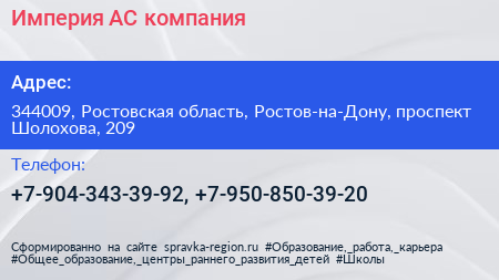 Империя-АС, компания по адресу 344009, Ростовская область, Ростов-на-Дону, проспект Шолохова, 209 в дальнейшем Организация, размещена в следующих категориях: