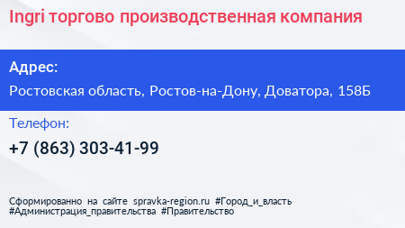 Ingri, торгово-производственная компания по адресу Ростовская область, Ростов-на-Дону, Доватора, 158Б в дальнейшем Организация, размещена в следующих категориях: