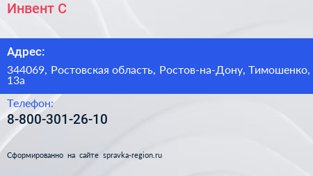 Инвент-С по адресу 344069, Ростовская область, Ростов-на-Дону, Тимошенко, 13а в дальнейшем Организация, размещена в следующих категориях: