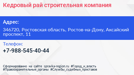 Кедровый рай, строительная компания по адресу 346720, Ростовская область, Ростов-на-Дону, Аксайский проспект, 11 в дальнейшем Организация, размещена в следующих категориях: