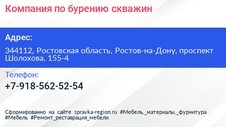 Компания по бурению скважин по адресу 344112, Ростовская область, Ростов-на-Дону, проспект Шолохова, 155-4 в дальнейшем Организация, размещена в следующих категориях: