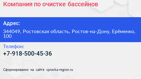 Компания по очистке бассейнов по адресу 344049, Ростовская область, Ростов-на-Дону, Ерёменко, 100 в дальнейшем Организация, размещена в следующих категориях: