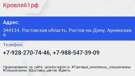 Кровля61.рф по адресу 344114, Ростовская область, Ростов-на-Дону, Армянская, 6 в дальнейшем Организация, размещена в следующих категориях: