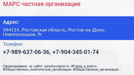 МАРС, частная организация по адресу 344114, Ростовская область, Ростов-на-Дону, Новополоцкая, 9г в дальнейшем Организация, размещена в следующих категориях: