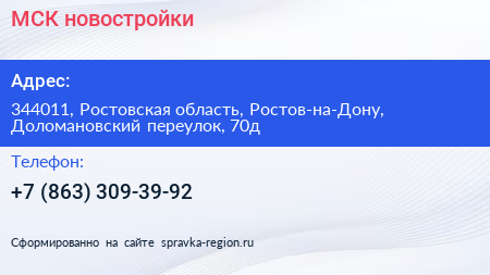 МСК, новостройки по адресу 344011, Ростовская область, Ростов-на-Дону, Доломановский переулок, 70д в дальнейшем Организация, размещена в следующих категориях: