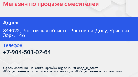 Магазин по продаже смесителей по адресу 344022, Ростовская область, Ростов-на-Дону, Красных Зорь, 146 в дальнейшем Организация, размещена в следующих категориях: