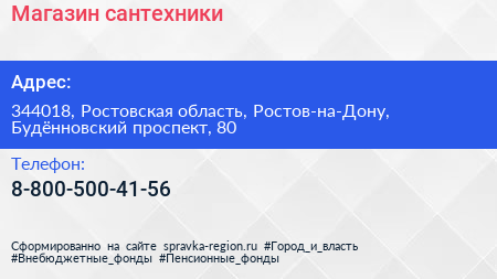 Магазин сантехники по адресу 344018, Ростовская область, Ростов-на-Дону, Будённовский проспект, 80 в дальнейшем Организация, размещена в следующих категориях: