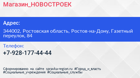 Магазин_НОВОСТРОЕК по адресу 344002, Ростовская область, Ростов-на-Дону, Газетный переулок, 84 в дальнейшем Организация, размещена в следующих категориях: