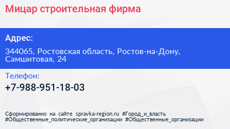 Мицар, строительная фирма по адресу 344065, Ростовская область, Ростов-на-Дону, Самшитовая, 24 в дальнейшем Организация, размещена в следующих категориях: