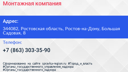 Монтажная компания по адресу 344082, Ростовская область, Ростов-на-Дону, Большая Садовая, 8 в дальнейшем Организация, размещена в следующих категориях: