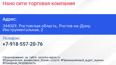 Нано-сити, торговая компания по адресу 344029, Ростовская область, Ростов-на-Дону, Инструментальная, 2 в дальнейшем Организация, размещена в следующих категориях: