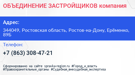 ОБЪЕДИНЕНИЕ ЗАСТРОЙЩИКОВ, компания по адресу 344049, Ростовская область, Ростов-на-Дону, Ерёменко, 89Б в дальнейшем Организация, размещена в следующих категориях: