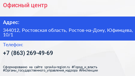 Для связи с организацией воспользуйтесь номером телефона: +7 (863) 269-49-69. Пн: c 09:00-18:00, Вт: c 09:00-18:00, Ср: c 09:00-18:00, Чт: c 09:00-18:00, Пт: c 09:00-18:00, Сб: выходной, Вс: выходной, вы можете обратиться в эту организацию.