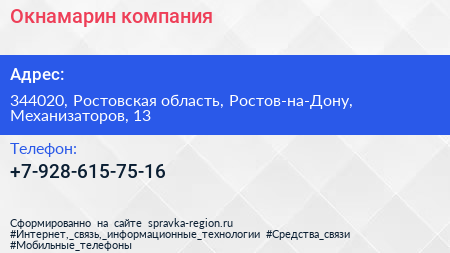 Окнамарин, компания по адресу 344020, Ростовская область, Ростов-на-Дону, Механизаторов, 13 в дальнейшем Организация, размещена в следующих категориях: