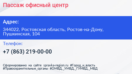 Пассаж, офисный центр по адресу 344022, Ростовская область, Ростов-на-Дону, Пушкинская, 104 в дальнейшем Организация, размещена в следующих категориях: