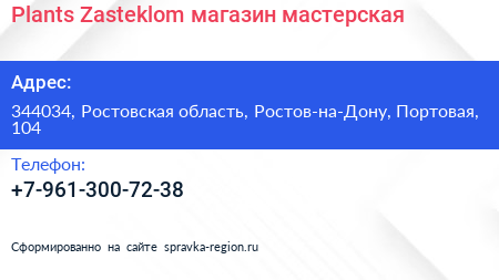 Plants Zasteklom, магазин-мастерская по адресу 344034, Ростовская область, Ростов-на-Дону, Портовая, 104 в дальнейшем Организация, размещена в следующих категориях: