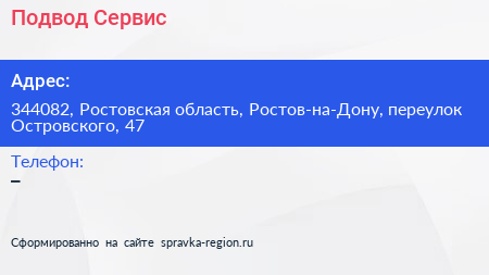 Подвод-Сервис по адресу 344082, Ростовская область, Ростов-на-Дону, переулок Островского, 47 в дальнейшем Организация, размещена в следующих категориях: