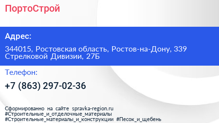 ПортоСтрой по адресу 344015, Ростовская область, Ростов-на-Дону, 339 Стрелковой Дивизии, 27Б в дальнейшем Организация, размещена в следующих категориях:
