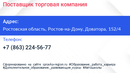 Для связи с организацией воспользуйтесь номером телефона: +7 (863) 224-56-77. Пн: c 09:00-18:00, Вт: c 09:00-18:00, Ср: c 09:00-18:00, Чт: c 09:00-18:00, Пт: c 09:00-18:00, Сб: выходной, Вс: выходной, вы можете обратиться в эту организацию.