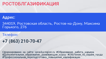 РОСТОБЛГАЗИФИКАЦИЯ по адресу 344019, Ростовская область, Ростов-на-Дону, Максима Горького, 276 в дальнейшем Организация, размещена в следующих категориях: