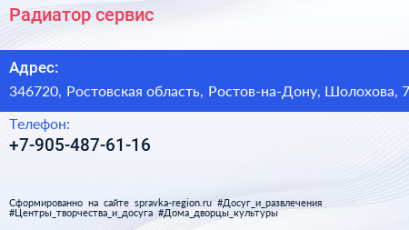 Радиатор сервис по адресу 346720, Ростовская область, Ростов-на-Дону, Шолохова, 7 в дальнейшем Организация, размещена в следующих категориях: