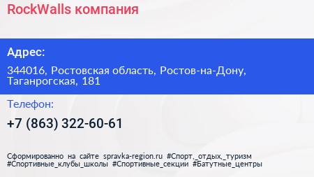 RockWalls, компания по адресу 344016, Ростовская область, Ростов-на-Дону, Таганрогская, 181 в дальнейшем Организация, размещена в следующих категориях: