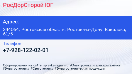 РосДорСторой-ЮГ по адресу 344064, Ростовская область, Ростов-на-Дону, Вавилова, 61/5 в дальнейшем Организация, размещена в следующих категориях: