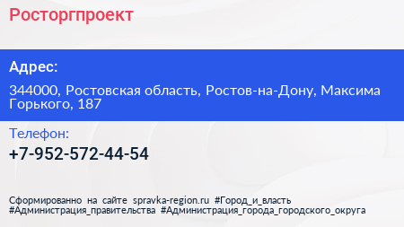 Росторгпроект по адресу 344000, Ростовская область, Ростов-на-Дону, Максима Горького, 187 в дальнейшем Организация, размещена в следующих категориях: