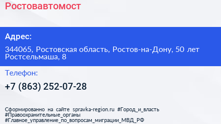 Ростовавтомост по адресу 344065, Ростовская область, Ростов-на-Дону, 50 лет Ростсельмаша, 8 в дальнейшем Организация, размещена в следующих категориях: