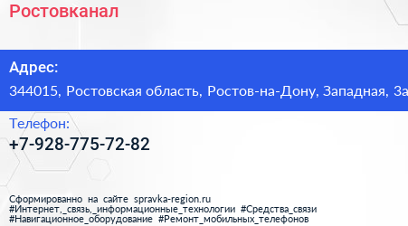 Ростовканал по адресу 344015, Ростовская область, Ростов-на-Дону, Западная, 3а в дальнейшем Организация, размещена в следующих категориях: