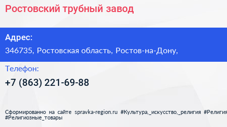 Ростовский трубный завод по адресу 346735, Ростовская область, Ростов-на-Дону, в дальнейшем Организация, размещена в следующих категориях: