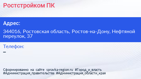 Ростстройком-ПК по адресу 344016, Ростовская область, Ростов-на-Дону, Нефтяной переулок, 37 в дальнейшем Организация, размещена в следующих категориях: