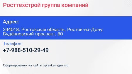 Росттехстрой, группа компаний по адресу 344018, Ростовская область, Ростов-на-Дону, Будённовский проспект, 80 в дальнейшем Организация, размещена в следующих категориях: