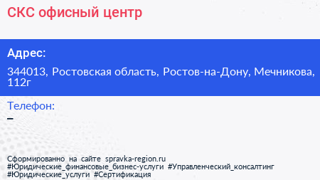 СКС, офисный центр по адресу 344013, Ростовская область, Ростов-на-Дону, Мечникова, 112г в дальнейшем Организация, размещена в следующих категориях: